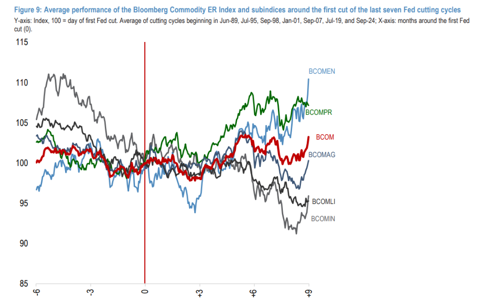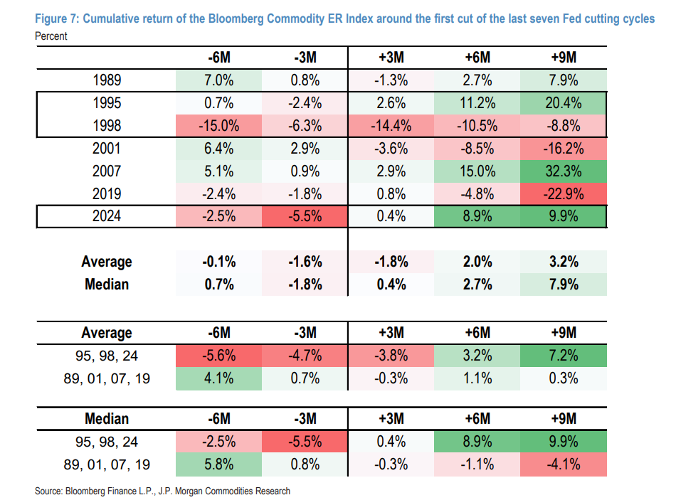 摩根大通报告指出,在经济“软着陆”或“中周期调整”的背景下,即所谓的“良性”降息周期,如1995年和2024年,大宗商品表现极为出色。在这些周期中,彭博大宗商品指数(BCOM)在首次降息后的9个月内,平均录得了15%的惊人回报,主要由能源和贵金属驱动。