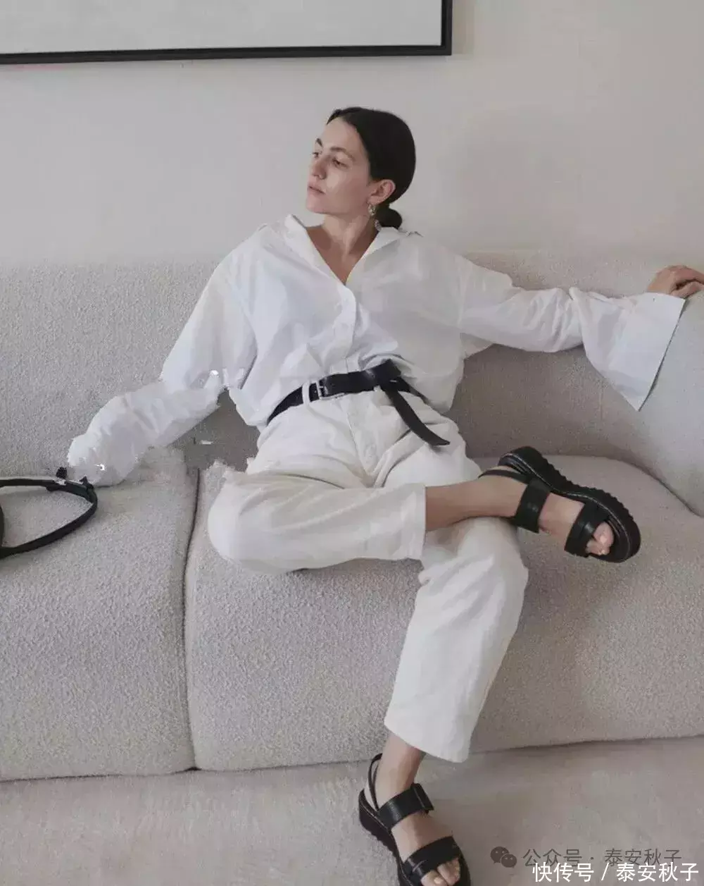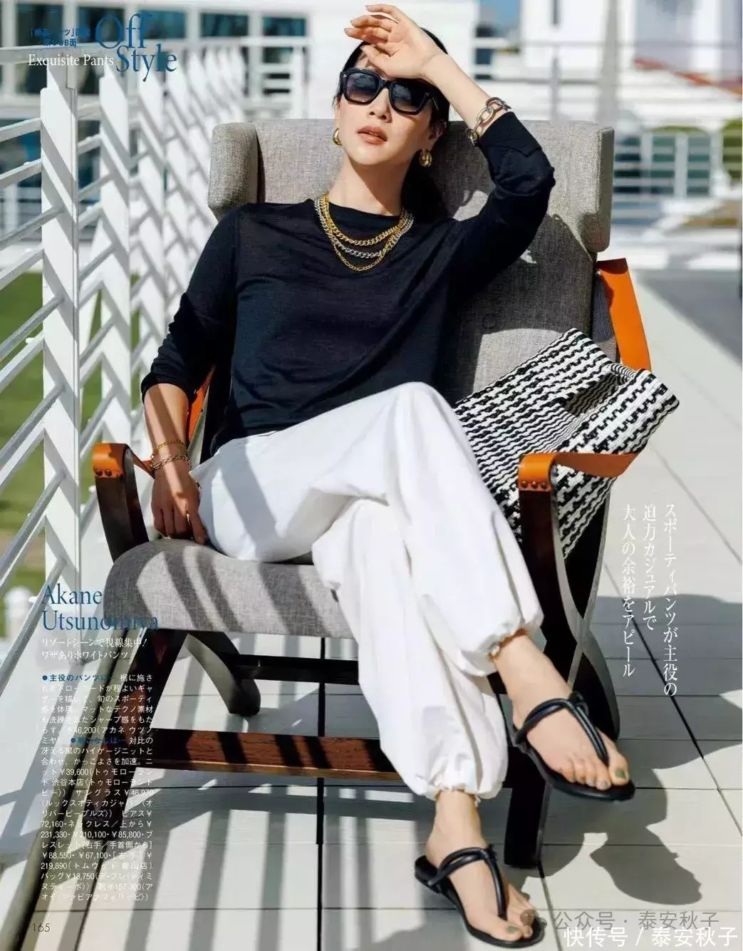 初秋的季节,可以给自己的衣柜里添条白裤子,不管如何搭,搭什么上衣,都能让你轻松展现从容洒脱的气质。比如一件修身的黑色针织衫,短一些的长度穿起来会更显利落高级。搭配白色的束脚裤与黑色夹趾鞋,就是一股潇洒又迷人的劲儿。